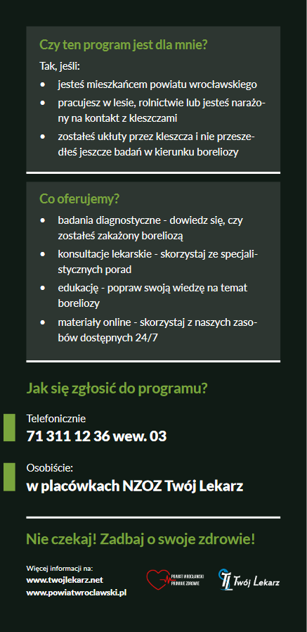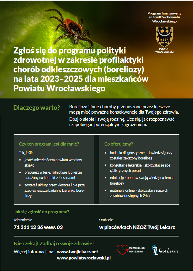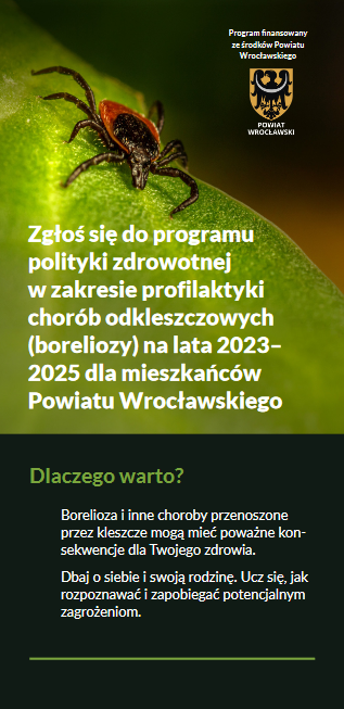 2 października 2023 r. rozpoczęła się realizacja bezpłatnego programu polityki zdrowotnej w zakresie profilaktyki chorób odkleszczowych (boreliozy) na lata 2023–2025 dla mieszkańców powiatu wrocławskiego.