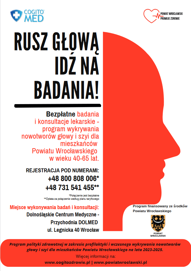 16 października 2023 r. rozpoczęła się realizacja bezpłatnego programu polityki zdrowotnej w zakresie profilaktyki chorób i wczesnego wykrywania nowotworów głowy i szyi dla mieszkańców powiatu wrocławskiego na lata 2023–2025.