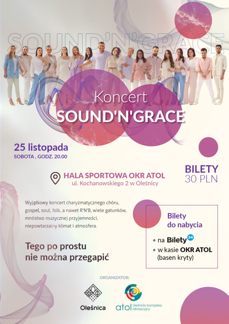 Tego jeszcze w OLEŚNICY nie było! Urząd Miasta Oleśnica wraz z ATOL Oleśnicki Kompleks Rekreacyjny organizuje dla Was niezwykłe wydarzenie! Niezwykły koncert SOUND’N’GRACE – już 25 listopada o godz. 20:00! Dajcie się porwać charyzmatycznemu chórowi.