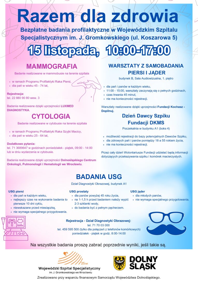 Profilaktyka stanowi nieodłączny element dbania o zdrowie. Wczesna diagnostyka ma ogromne znaczenie, zwiększając szanse na pełne wyleczenie. Informujemy o organizowanej przy wsparciu Urzędu Marszałkowskiego Województwa Dolnośląskiego akcji profilaktycznej „Razem dla Zdrowia”, której celem jest dostarczenie mieszkańcom Dolnego Śląska bezpłatnych badań i warsztatów.