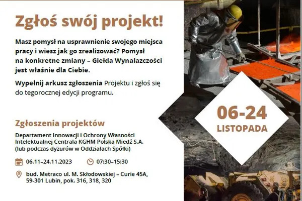 KGHM czeka na zgłoszenia projektów o charakterze technicznym lub techniczno-organizacyjnym w obszarze technologii, ale również w zakresie środowiska pracy, w szczególności poprawy bezpieczeństwa i higieny pracy.