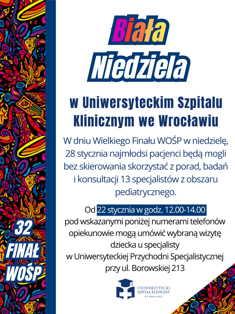 W dniu finału Wielkiej Orkiestry Świątecznej Pomocy w niedzielę, 28 stycznia w Uniwersyteckim Szpitalu Klinicznym we Wrocławiu zostanie zorganizowana Biała Niedziela, w trakcie której najmłodsi pacjenci bez skierowania będą mogli skorzystać z porad, badań i konsultacji aż 13 specjalistów z obszaru pediatrycznego. W poniedziałek, 22 stycznia rusza rejestracja pacjentów.