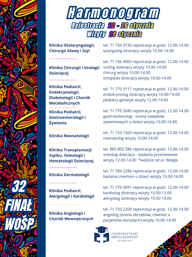 - Klinika Chirurgii i Urologii Dziecięcej – tel. do rejestracji 71 736 4900 w godz. 12.00–14.00; niedzielne konsultacje: urologa dziecięcego w godz. 10.00–14.00, chirurga w godz. 10.00–14.00, ortopedy dziecięcego w godz. 10.00–14.00.