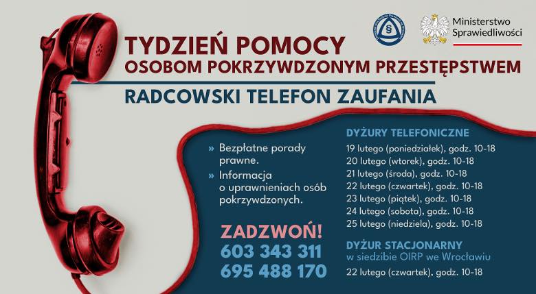 Okręgowa Izba Radców Prawnych we Wrocławiu, jak co roku, włącza się w „Tydzień Pomocy Osobom Pokrzywdzonym Przestępstwem” – akcję Ministerstwa Sprawiedliwości, której celem jest zwrócenie szczególnej uwagi na potrzeby i prawa osób pokrzywdzonych przestępstwem.