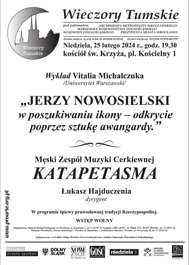 Podczas pierwszego w tym roku, lutowego Wieczoru Tumskiego, usłyszymy wykład Witalia Michalczuka z Uniwersytetu Warszawskiego zatytułowany „Jerzy Nowosielski. W poszukiwaniu ikony – odkrycie poprzez sztukę awangardy”. W drugiej części Wieczoru wystąpi Męski Zespół Muzyki Cerkiewnej „Katapetasma”, pod dyrekcją Łukasza Hajduczeni. Wykonają oni dla Państwa śpiewy prawosławnej tradycji Rzeczypospolitej.