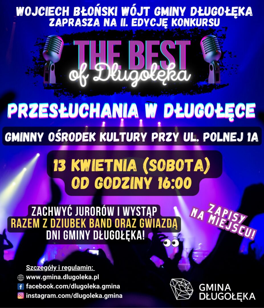 Zapisy będą odbywać się na miejscu przesłuchań, od godziny 15:00. Więcej szczegółów i regulamin konkursu dostępny na www.gmina.dlugoleka.pl.