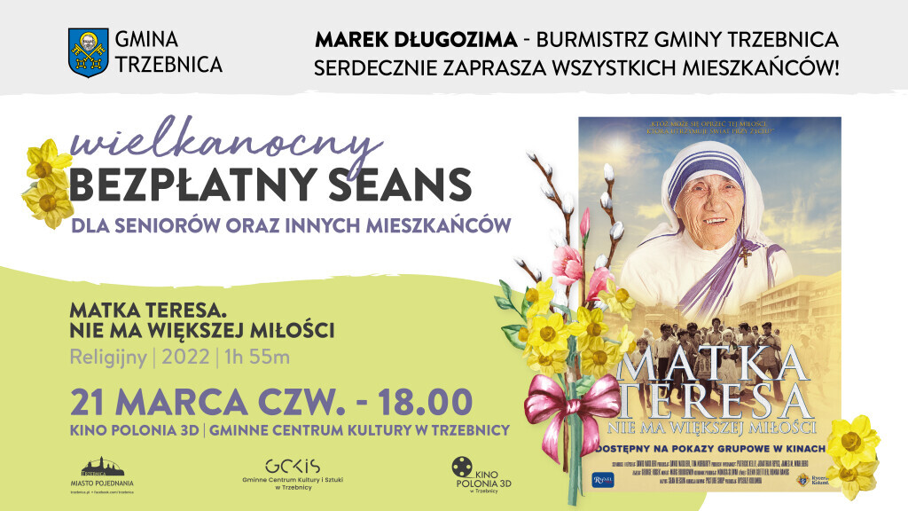 Tradycją jest już, że w okresie świątecznym burmistrz Marek Długozima zaprasza wszystkich mieszkańców, a w szczególności seniorów z Gminy Trzebnica na specjalny, nieodpłatny seans w Kinie Polonia 3D. Wielkanocna propozycja to dokument „Matka Teresa. Nie ma większej miłości!” wyprodukowany przez Rycerzy Kolumba we współpracy ze Zgromadzeniem Sióstr Misjonarek Miłości. Seans odbędzie się w czwartek 21 marca.