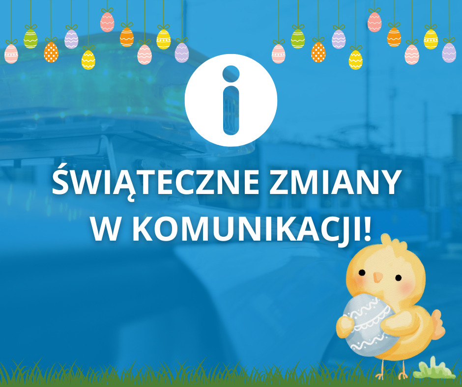 31.03 – 01.04. 2024 (Święta Wielkanocne) Wszystkie linie tramwajowe będą kursowały wg świątecznych rozkładów jazdy z częstotliwością co 30 minut. Wszystkie linie autobusowe będą kursowały wg niedzielnychrozkładów jazdy z poniższymi wyjątkami: zawieszone zostanie kursowanie linii: 108, 124, 130, 131, 146, 149 i 602, natomiastlinie autobusowe: D, K, N, 102, 103, 105, 106, 111, 114, 115, 116, 121, 122, 126, 127, 134, 143, 144, 151