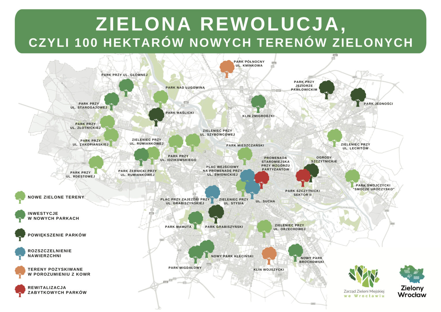 – Park nad Ługowiną – jesienią 2018 roku, na terenie o pow. 2,6 ha posadzono ok. 170 drzew (Wrośnij we Wrocław). W tym przypadku szykowane są materiały na podstawie, których będzie można zlecić projektowanie.