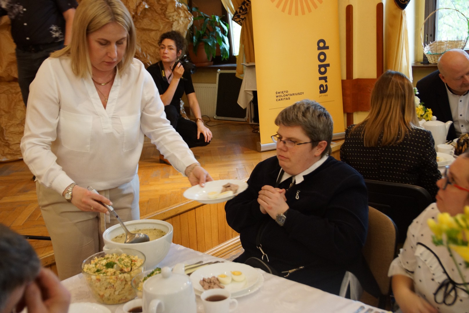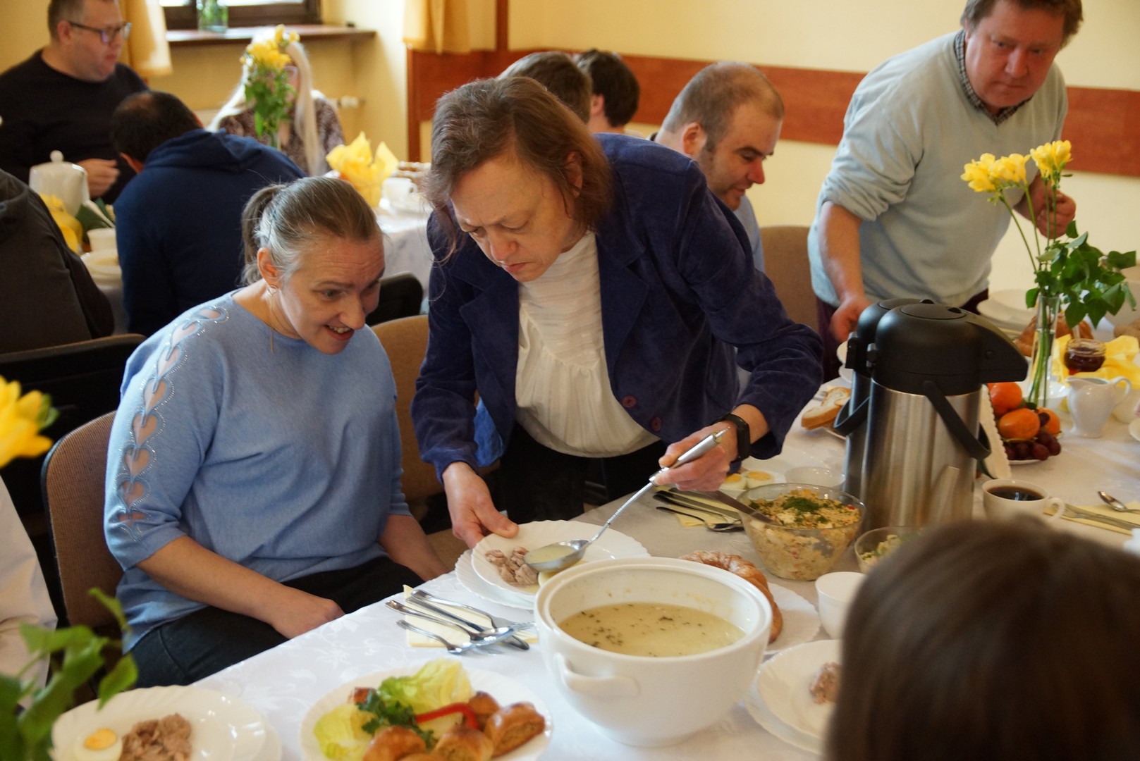 Ksiądz Dariusz Amrogowicz, dyrektor Caritas Archidiecezji Wrocławskiej, pobłogosławił pokarmy na świąteczny stół. Do osób z niepełnosprawnościami, które korzystają ze wsparcia warsztatów terapii zajęciowej, zwrócił się słowami, mówiącymi o całorocznym przeżywaniu Wielkanocy. -Jesteście bardzo kochani” – rozpoczął – i tym ukochaniem przyjechaliśmy się nasycić, zaczerpnąć, bo u was nie tylko Wielkanoc trwa dłużej, ale i tajemnice Wielkiego Tygodnia rozciągają się na cały rok. W tym miejscu nie brakuje ani wielkopiątkowego cierpienia, ani radości wielkanocnej, w każdym dniu – mówił dyrektor. Dla wszystkich uczestników spotkania przygotowany był świąteczny poczęstunek składający się z tradycyjnych potraw wielkanocnych.
