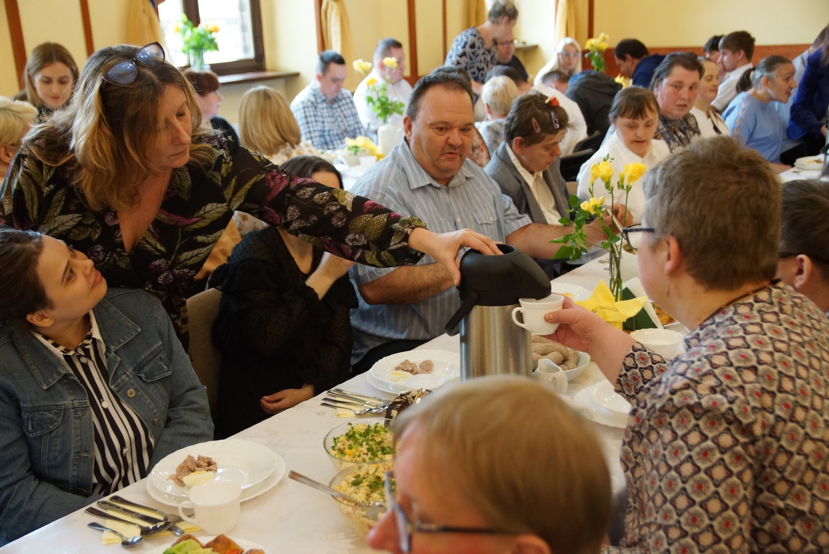 Ksiądz Dariusz Amrogowicz, dyrektor Caritas Archidiecezji Wrocławskiej, pobłogosławił pokarmy na świąteczny stół. Do osób z niepełnosprawnościami, które korzystają ze wsparcia warsztatów terapii zajęciowej, zwrócił się słowami, mówiącymi o całorocznym przeżywaniu Wielkanocy. -Jesteście bardzo kochani” – rozpoczął – i tym ukochaniem przyjechaliśmy się nasycić, zaczerpnąć, bo u was nie tylko Wielkanoc trwa dłużej, ale i tajemnice Wielkiego Tygodnia rozciągają się na cały rok. W tym miejscu nie brakuje ani wielkopiątkowego cierpienia, ani radości wielkanocnej, w każdym dniu – mówił dyrektor. Dla wszystkich uczestników spotkania przygotowany był świąteczny poczęstunek składający się z tradycyjnych potraw wielkanocnych.