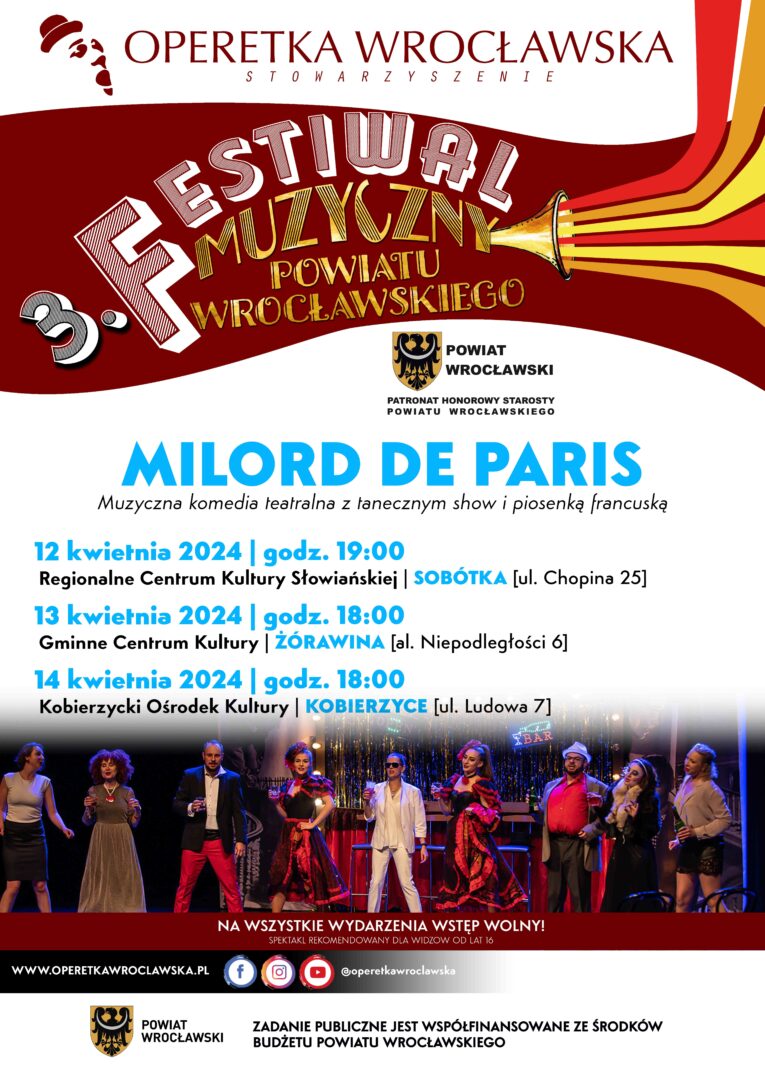 W ramach kwietniowej odsłony III Festiwalu Muzycznego Powiatu Wrocławskiego trzykrotnie zostanie zaprezentowany wielki komediowy przebój Teatru Scena Kamienica „Milord de Paris”.