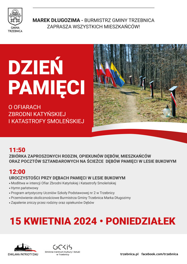 W poniedziałek 15 kwietnia zgodnie z wieloletnią tradycją w Trzebnicy będzie obchodzony Dzień Pamięci o Ofiarach Zbrodni Katyńskiej i Katastrofy Smoleńskiej, w ramach ogólnokrajowego upamiętnienia ofiar obu tragicznych wydarzeń. Wydarzenie odbędzie się w Lesie Bukowym – na Ścieżce Dębów Pamięci, posadzonych właśnie dla uczczenia pamięci pomordowanych w 1940 roku w Katyniu oficerów Wojska Polskiego.