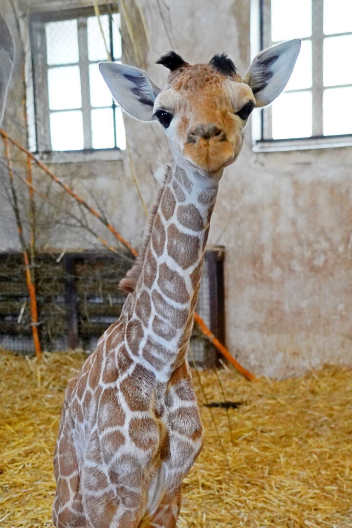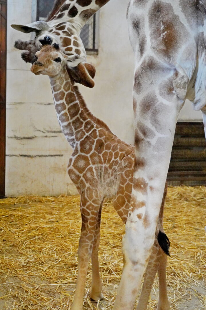 Tymczasem mała żyrafka pojawiła się na świecie 3 kwietnia i jak na żyrafę przystało, zaczęła chodzić na krótko po porodzie. Rozwija się prawidłowo, chętnie pije mleko i spogląda na mamę oraz opiekunów swoimi pięknymi, wielkimi, czarnymi oczami. Nie odstępuje mamy na krok. Jej tatą jest nasz jedyny samiec, Rafiki.