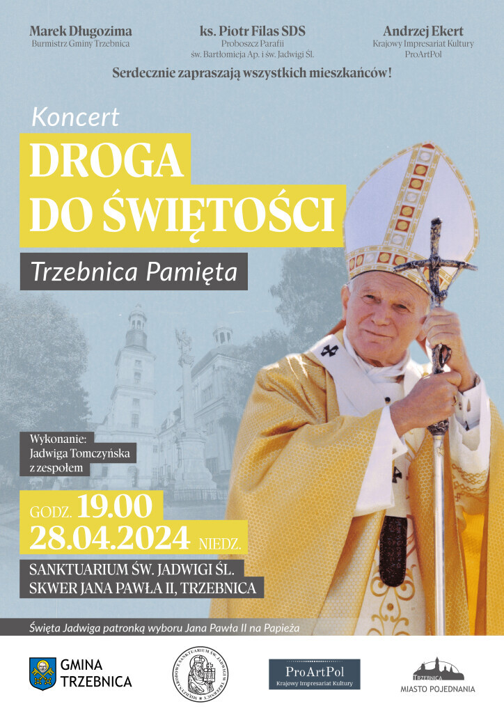 Gmina Trzebnica zaprasza wszystkich mieszkańców na koncert „Droga do Świętości”, który odbędzie się 28 kwietnia 2024 r. w Sanktuarium św. Jadwigi Śl. Skwer Jana Pawła II w Trzebnicy. Wydarzenie rozpocznie się po mszy świętej o godzinie 19.00.