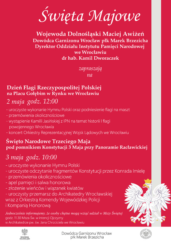 Na uroczystości świąt: Dzień Flagi Rzeczypospolitej Polskiej oraz Święto Konstytucji 3 Maja zaprasza Maciej Awiżeń – wojewoda dolnośląski.