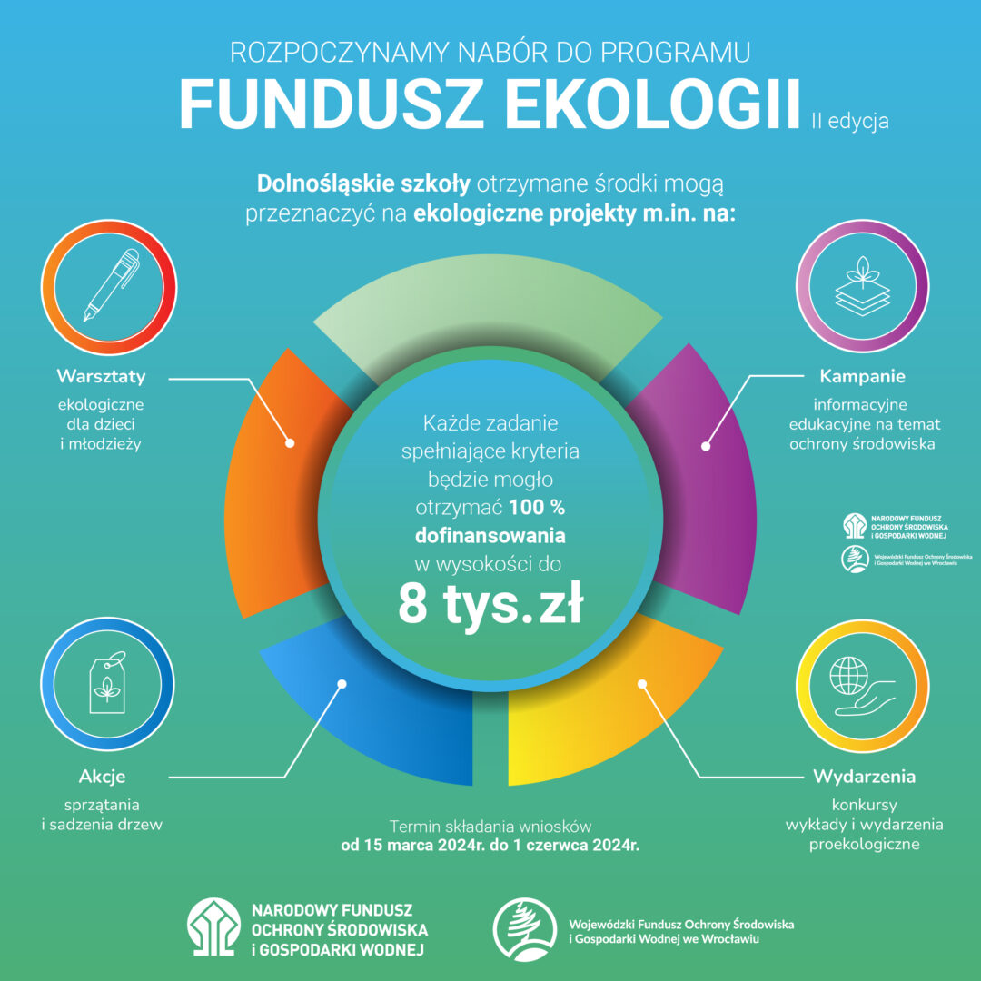 „Fundusz Ekologii” ma na celu wsparcie działań proekologicznych wśród uczniów. Program przewiduje wsparcie różnorodnych działań związanych z ekologią do kwoty 8 tys. zł na jedno przedsięwzięcie.