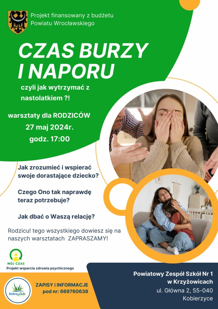 Powiat Wrocławski oferuje także wsparcie psychologiczne dorosłych. Dzięki warsztatom terapeutycznym dla rodziców pn. „Czas burzy i naporu” oraz cyklu warsztatów terapeutyczno – rozwojowych dla dorosłych pn. „Czas dla mnie”, osoby, które potrzebują odzyskać spokój i opanowanie lub zrozumieć swoje dziecko, znajdą zrozumienie oraz wsparcie. Spotkania realizowane będą: