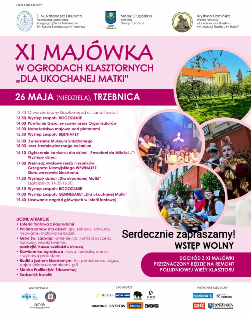 W szczególnym dniu odbędzie się XI Majówka w ogrodach klasztornych w Trzebnicy. Wydarzeniu będzie towarzyszyć nie tylko wiele atrakcji czy dobre jedzenie, ale przede wszystkim Matka, czyli Maryja, a także matka kościoła Śląskiego – św. Jadwiga. Do świętowania dnia matki u stóp pani trzebnickiej zapraszają organizatorzy, czyli siostry boromeuszki, Fundacja dla ratowania klasztoru św. Jadwigi „By Służyć” oraz Gmina Trzebnica.