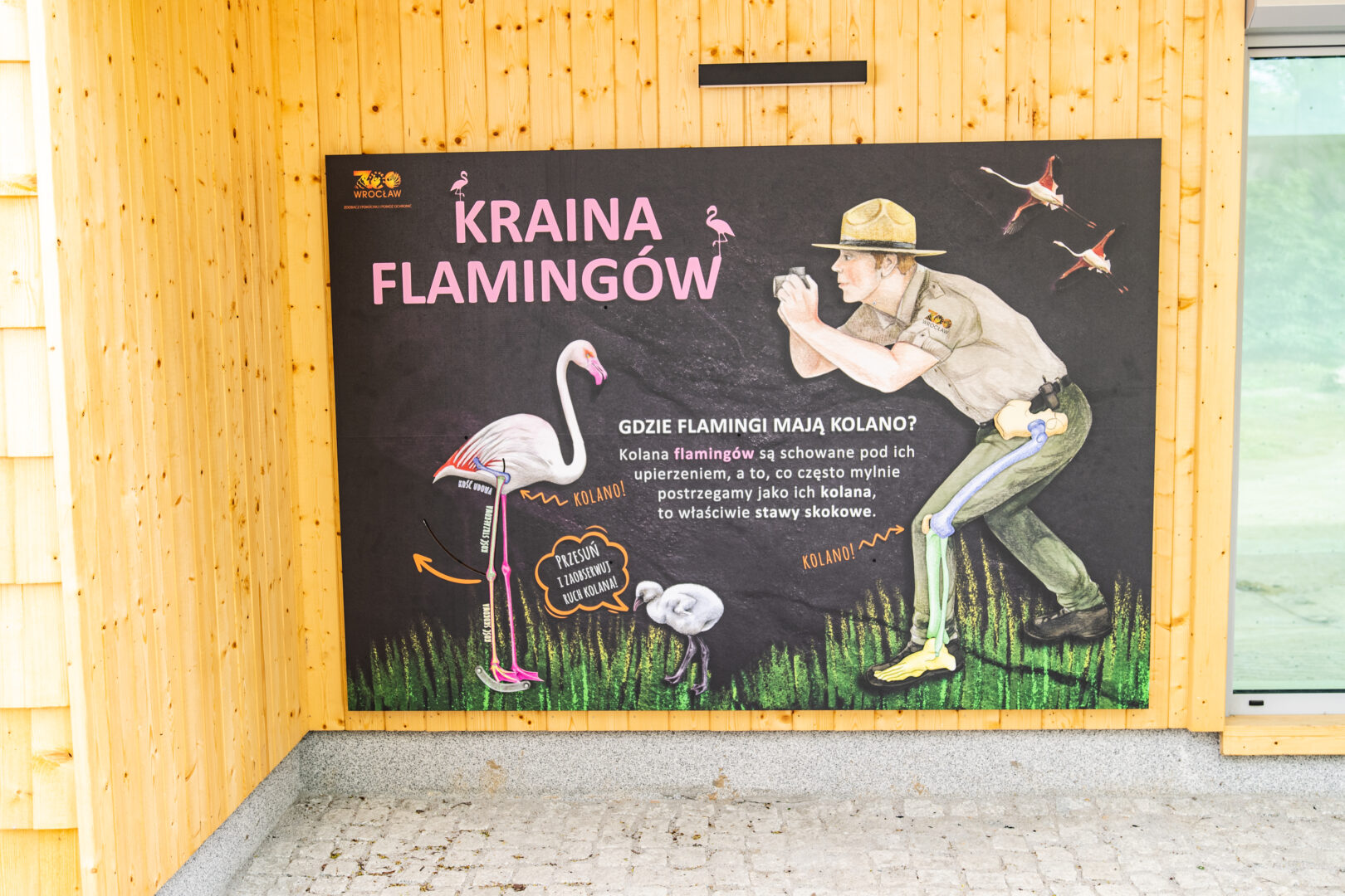 Plansze edukacyjne na pawilonie flamingów pokazują różne gatunki tych ciekawych ptaków. Różnią się one od siebie wielkością, zasięgiem występowania, czy też intensywnością koloru upierzenia. Dla tych, którzy chcą dowiedzieć się, gdzie flaming ma kolano, także się coś znajdzie. To, co wielu z nas ma za kość strzałkową flamingów, jest już ich… stopą.