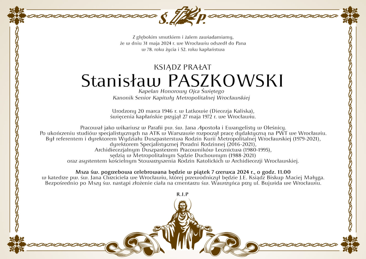 Pogrzeb śp. ks. prałata Stanisława Paszkowskiego odbędzie się w piątek 7 czerwca o godz. 11:00 w Katedrze Wrocławskiej. Po Mszy św. pochówek odbędzie się na cmentarzu św. Wawrzyńca przy ul. Bujwida we Wrocławiu.