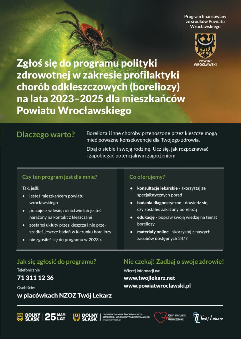 Program polityki zdrowotnej w zakresie profilaktyki chorób odkleszczowych (boreliozy) na lata 2023–2025 dla mieszkańców Powiatu Wrocławskiego jest w 2024 r. realizowany ze środków budżetowych Powiatu Wrocławskiego oraz przy wsparciu finansowym Samorządu Województwa Dolnośląskiego.