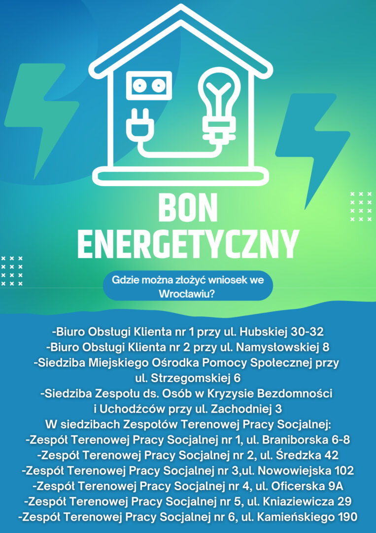 Realizacją bonu energetycznego będzie zajmować się Dział Świadczeń Miejskiego Ośrodka Pomocy Społecznej. W celu usprawnienia obsługi wnioski będą przyjmowane w kilku lokalizacjach MOPS: