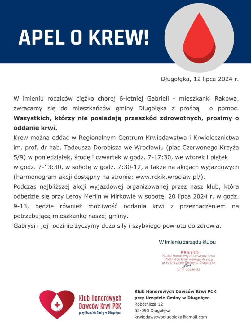 Klub Honorowych Dawców Krwi PCK przy Urzędzie Gminy w Długołękce wraz z Wójtem Wojciechem Błońskim zapraszają na 𝟮𝟳. akcję oddawania krwi na terenie Gmina Długołęka, która tym razem odbędzie się w sobotę, 𝟮𝟎 lipca 𝟮𝟎𝟮𝟒 roku w godz. 𝟵-𝟭𝟑 przy GIGAmarkecie Leroy Merlin w Mirkowie (Mirków, ul. Kiełczowska 1E).