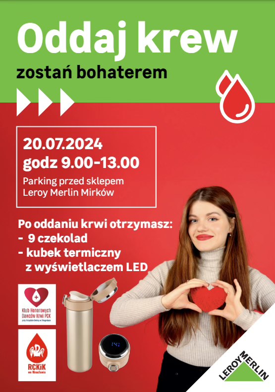 Po oddaniu krwi odbierzesz również niespodziankę przygotowaną przez pracowników Leroy Merlin GIGAmarketu w Mirkowie – kubek termiczny z wyświetlaczem LED.
