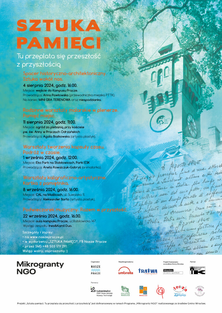 Stowarzyszenie Nasze Pracze zaprasza do udziału w projekcie „Sztuka pamięci. Tu przeplata się przeszłość z przyszłością”. W sierpniu i wrześniu organizowany będzie cykl warsztatów artystyczno-historycznych, które nawiązują do niezwykłej historii Praczów Odrzańskich oraz dawnych mieszkańców tego osiedla.
