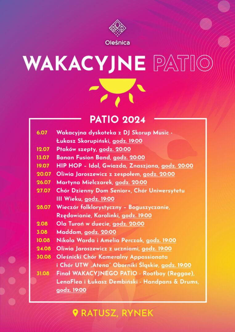 Już w najbliższą sobotę, 24 sierpnia na wakacyjnym Patio w Oleśnicy usłyszycie uczniów Oliwię Jaroszewicz i Oskara Kolberta. Koncerty odbywają się w oleśnickim ratuszu. Sobotni koncert rozpocznie się o godzinie 19.