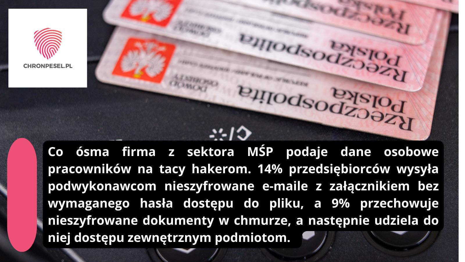 Mikro, małe i średnie firmy najczęściej przetwarzają imię i nazwisko zatrudnianych pracowników (86 proc.), a także numer telefonu (80 proc.). Nieco rzadziej adres zamieszkania i numer PESEL (po 75 proc.). W dalszej kolejności adres e-mail (70 proc.), numer rachunku bankowego (68 proc.) i dowodu osobistego (62 proc.), oraz dane zdrowotne o absencjach czy przebytych chorobach (43 proc.). W rezultacie z powodu słabego poziomu zabezpieczeń w wielu MŚP, hakerzy w bardzo prosty sposób mogą wykraść komplet danych osobowych potrzebnych do popełnienia przestępstwa.