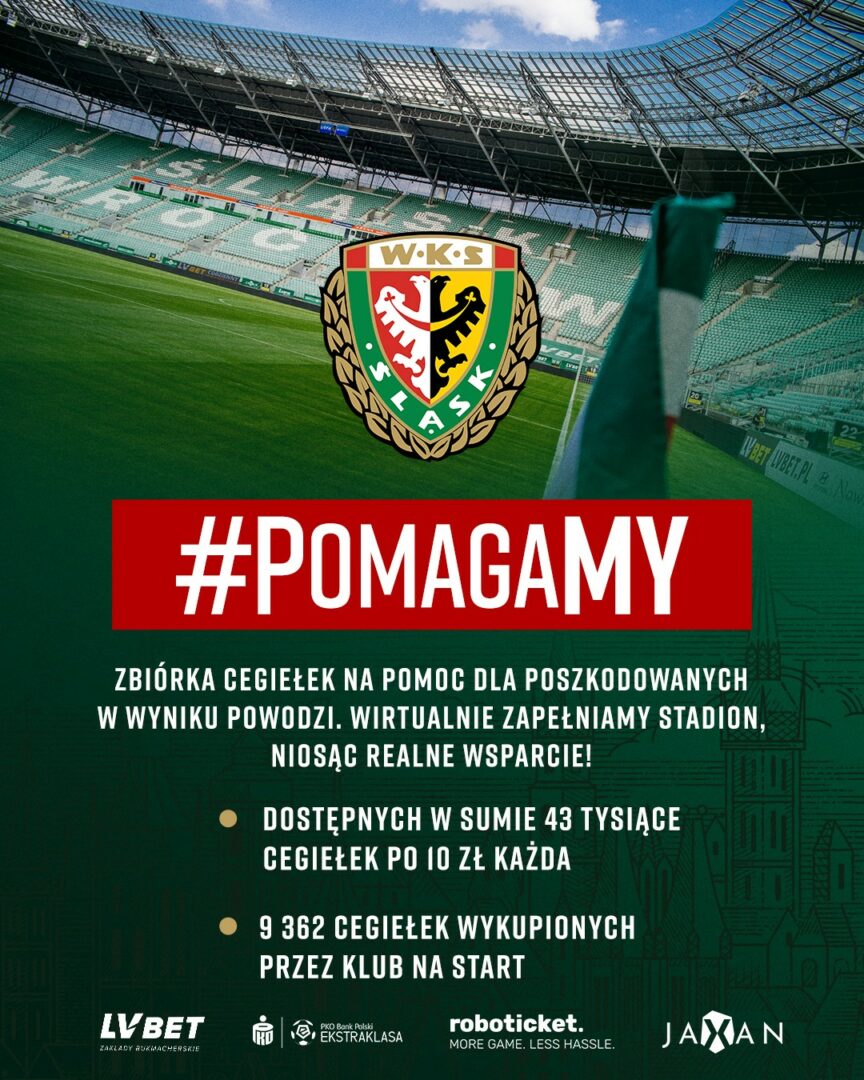 Tarczyński Arena Wrocław jest w stanie pomieścić ok. 43 tysiące osób. Dziś klub chce zapełnić stadion wirtualnie i zachęca kibiców do nabywania cegiełek o wartości 10 zł. Na sam początek Śląsk zdecydował się na zakup 9 362 „biletów” – na takiej liczbie zatrzymał się licznik sprzedanych wejściówek na spotkanie ze Stalą. Cały dochód zostanie przeznaczony na pomoc osobom poszkodowanym przez powódź. O akcji mówi Patryk Załęczny, prezes WKS-u.