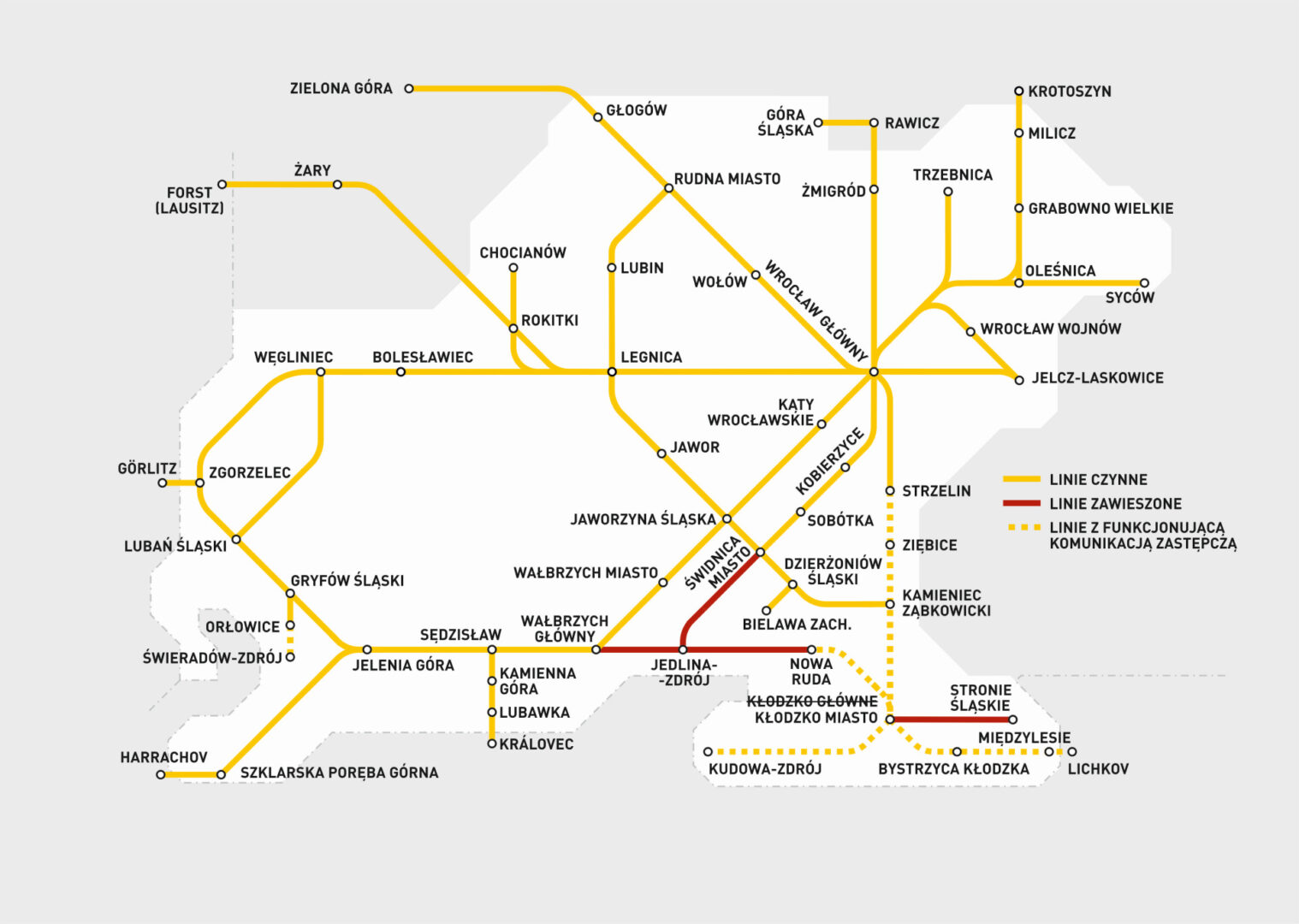 Linia obsługiwana jest pasażersko, możliwe są miejscowe podtopienia i zastąpienie pociągów autobusami na poszczególnych odcinkach. Prosimy przed planowaną podróżą o sprawdzanie informacji na stronie www.kolejedolnoslaskie.pl.