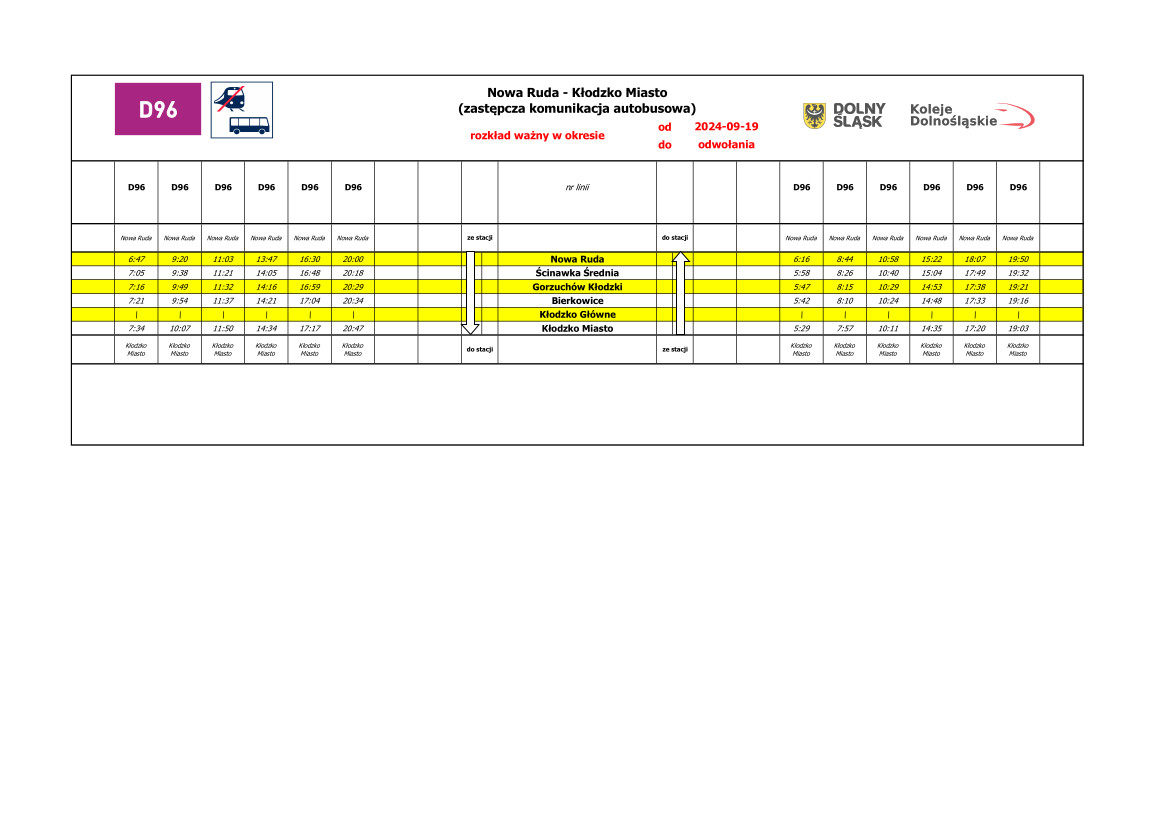 Awaryjne rozkłady jazdy dla odcinka Nowa Ruda – Kłodzko Miasto:
