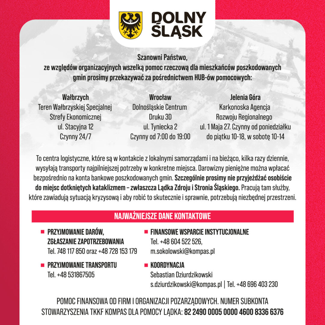 Szanowni Państwo, bardzo dziękujemy za zaangażowanie i wszelką pomoc przekazaną dla Dolnoślązaków zmagających się ze skutkami powodzi w regionie. Wiele osób bezinteresownie pomaga innym lub wozi na miejsce różnego rodzaju dary. Skala Państwa działań jest ogromna, dlatego konieczne okazało się wprowadzenie rozwiązań logistycznych, które usprawnią cały proces. Działający w Kotlinie Kłodzkiej sztab kryzysowy składający się między innymi ze straży pożarnej, wojska, policji i przedstawicieli województwa prosi, aby stosować się do poniższych zaleceń: