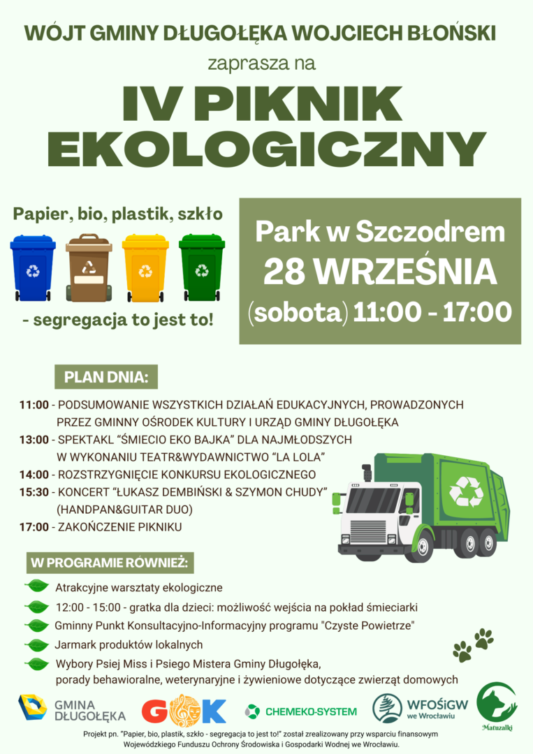 Wójt Gminy Długołęka Wojciech Błoński zaprasza do parku w Szczodrem na podsumowanie wszystkich działań edukacyjnych, prowadzonych przez Gminny Ośrodek Kultury i Urząd Gminy Długołęka pod hasłem „Papier, bio, plastik, szkło – segregacja to jest to!”.