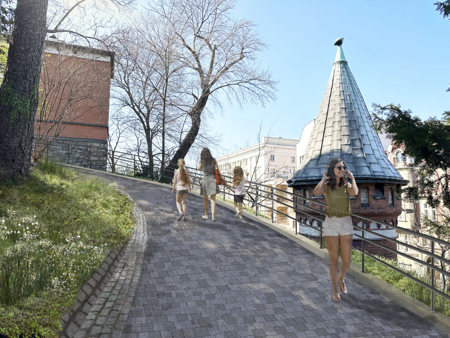 - Przebudowa południowej ścieżki/drogi, uwzględniająca nawierzchnię, oświetlenie oraz balustrady z pochwytem dla osób z niepełnosprawnościami.