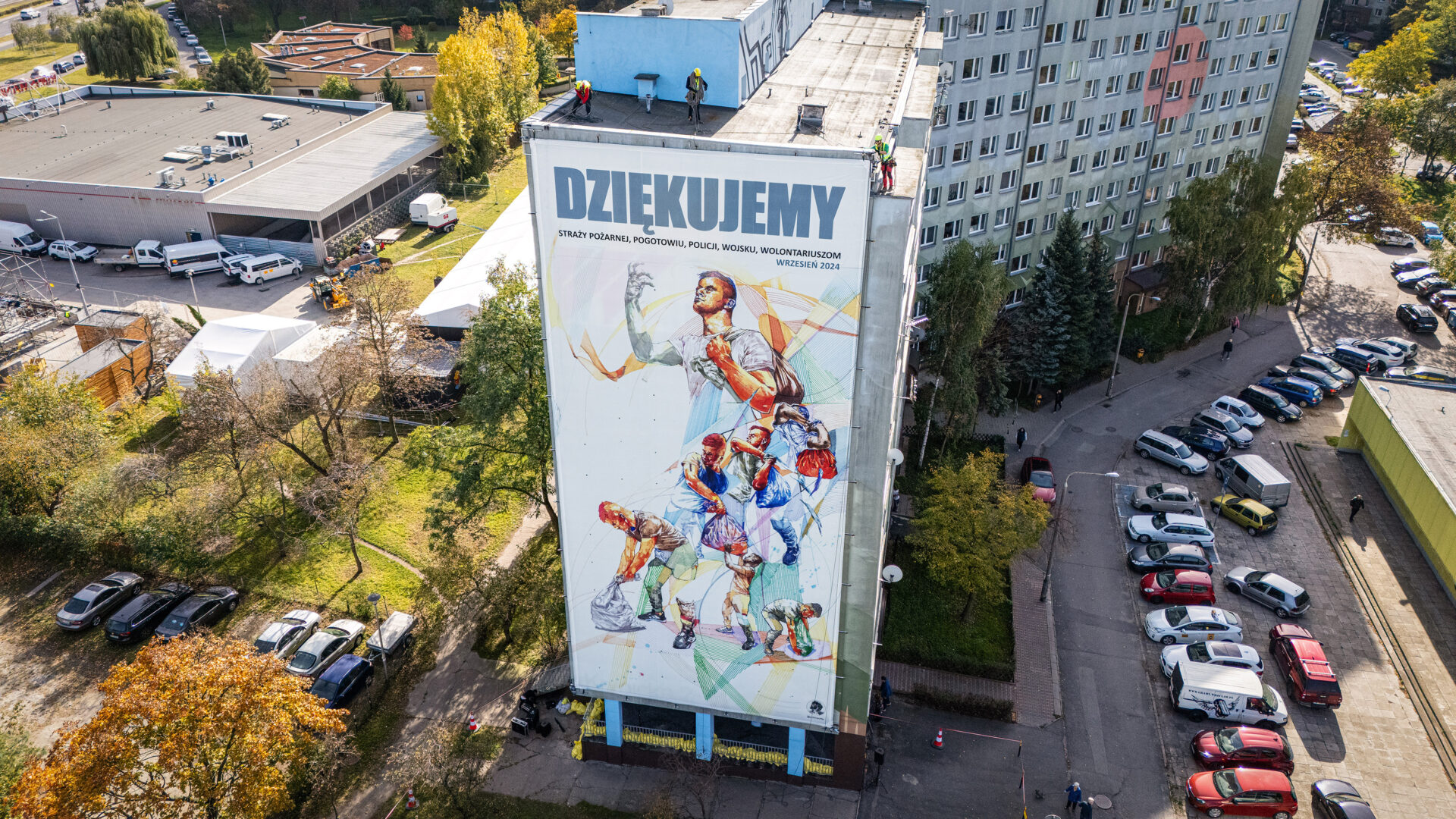 Kilkadziesiąt tysięcy żołnierzy, policjantów, strażaków, ratowników i wolontariuszy było zaangażowanych w walkę z powodzią i jej skutkami. Duża część z nich nadal pracuje na popowodziowym froncie. Spółdzielnia Mieszkaniowa Wrocław-Południe wraz z firmą Braughman Group Media znalazły symboliczny sposób, żeby „Dziękuję” dla służb i ochotników trwało w naszej świadomości. 18 października na elewacji wieżowca przy ul. Krynickiej 2 pojawiła się grafika wielkoformatowa jako wyraz hołdu złożonego wszystkim niosącym pomoc w czasie powodzi. Pozostanie tam aż do lutego 2025 roku.