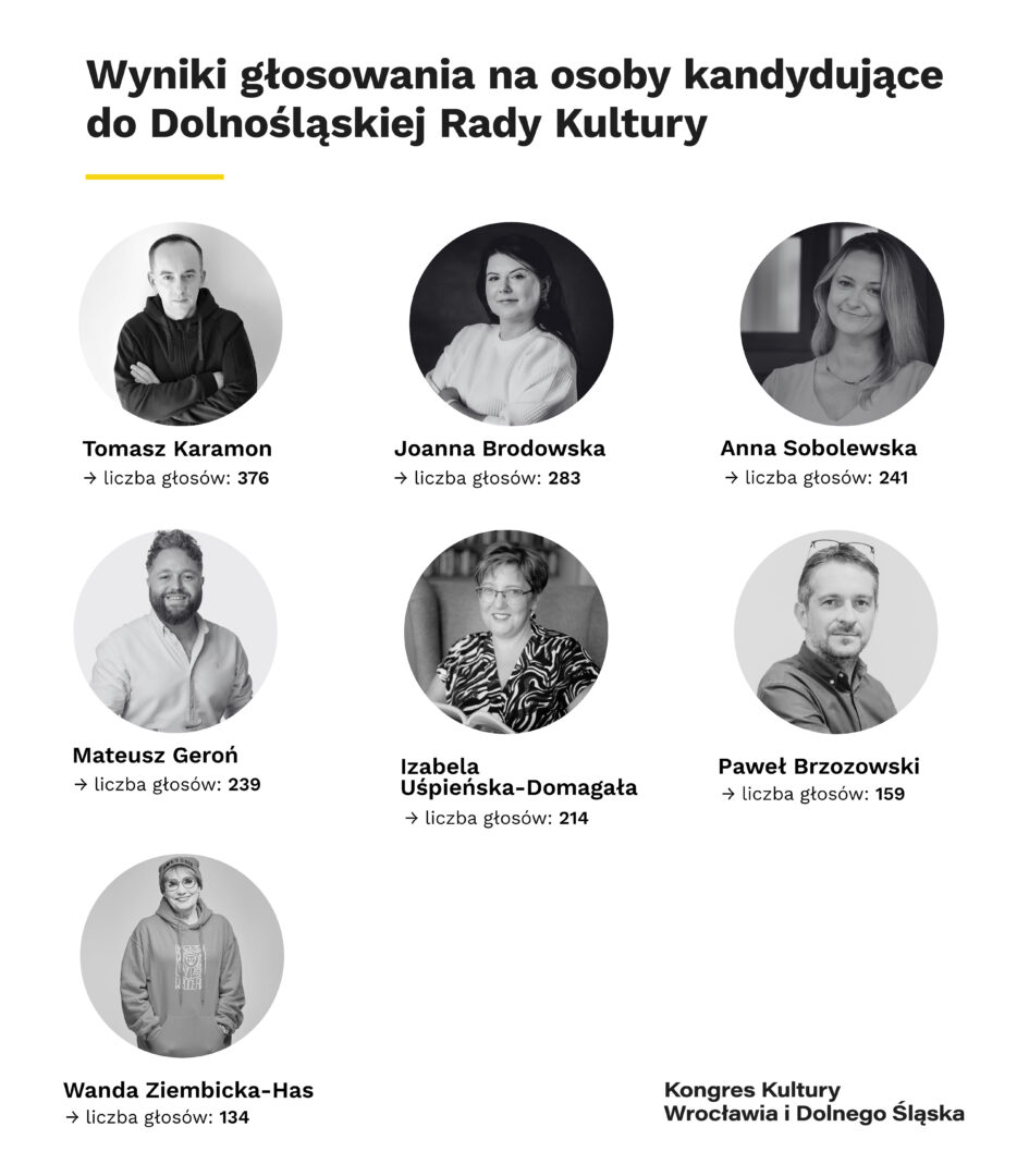 26 października 2024 r., zakończyło się otwarte głosowanie do Wrocławskiej Rady Kultury oraz Dolnośląskiej Rady Kultury. Ciała te mają charakter doradczy i będą wspierać odpowiednio prezydenta Wrocławia oraz marszałka województwa dolnośląskiego w zakresie polityki kulturalnej przez najbliższe trzy lata. Oddano łącznie 6623 głosy!