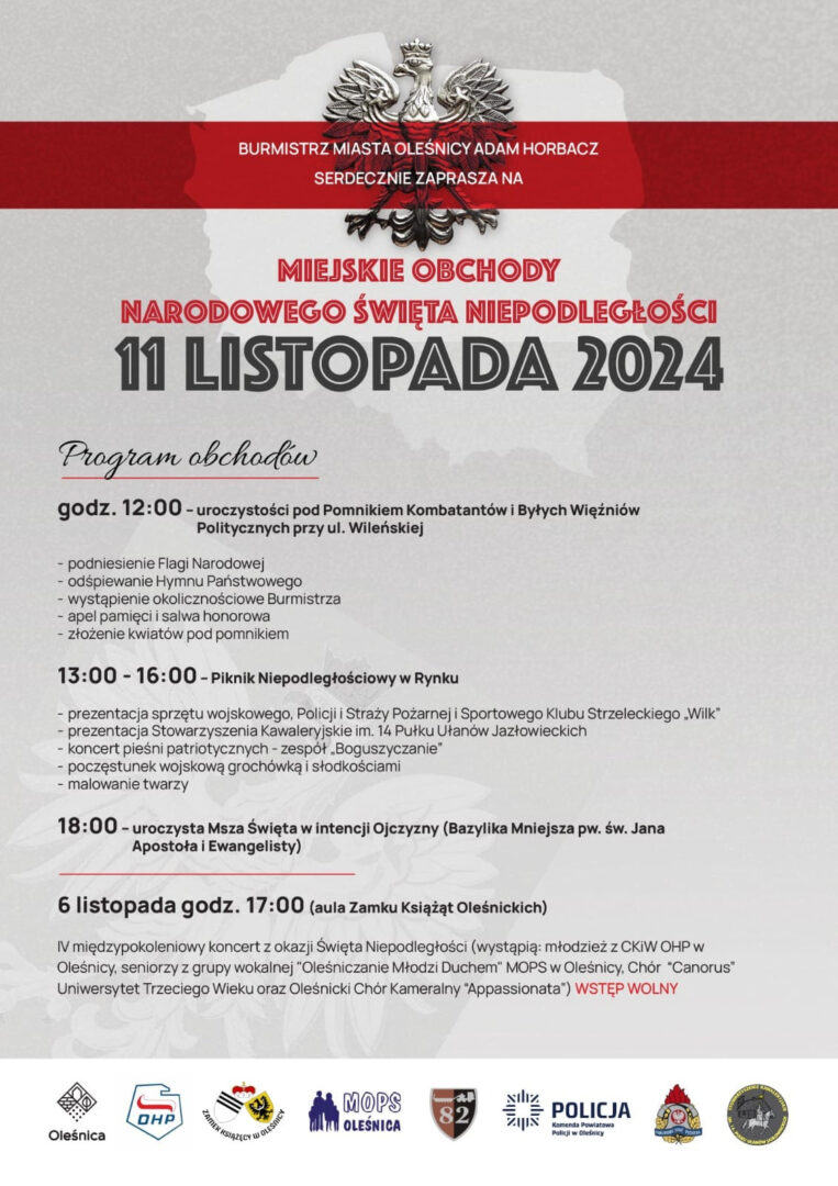 Burmistrz Adam Horbacz zaprasza wszystkich do udziału w miejskich obchodach Święta Niepodległości w Oleśnicy.