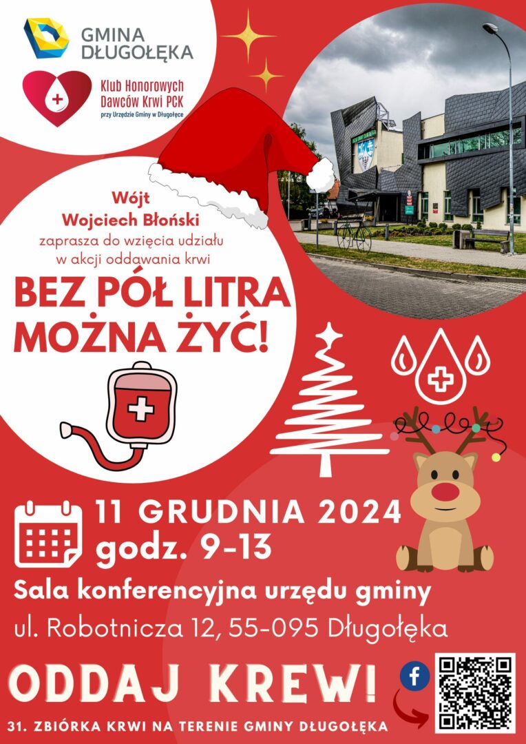 „Bez pół litra, można żyć!” – takim hasłem Klub Honorowych Dawców Krwi PCK przy Urzędzie Gminy w Długołęce wraz z Wójtem Wojciechem Błońskim oraz pracownikami urzędu zachęcają do udziału w 31. Akcji oddawania krwi na terenie gminy Długołęka, która odbędzie się 11 grudnia 2024 r. w godzinach 9:00-13:00 w Sali konferencyjnej w Urzędzie Gminy Długołęka.