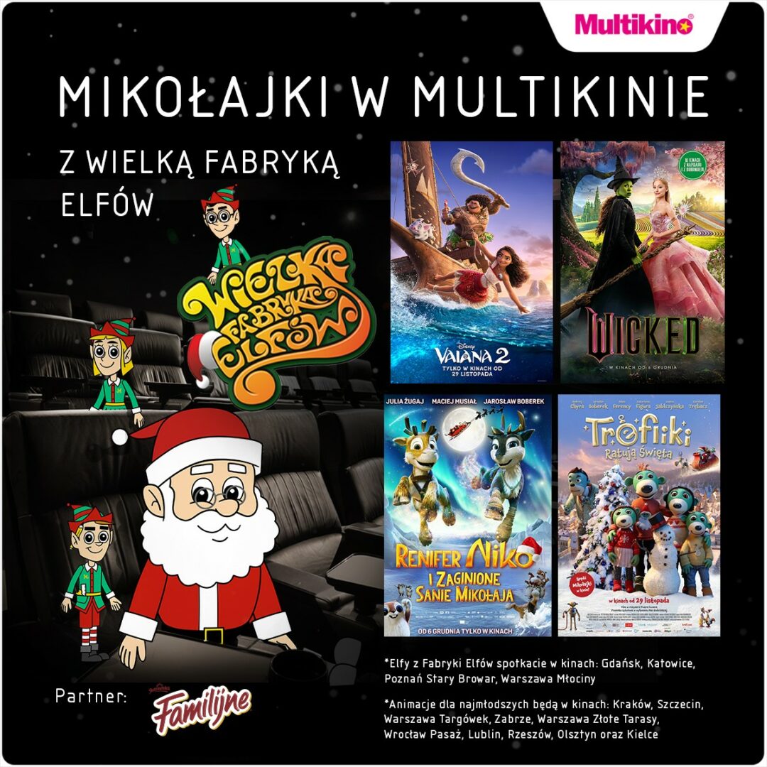 Początek grudnia zapowiada się wyjątkowo. Dzieci czekają aż trzy dni pełne radości i filmowych przygód, czyli Mikołajki w Multikinie! Każda z magicznych premier zabierze najmłodszych do niezwykłych światów, tworząc niezapomniane wspomnienia. Ponadto w piątek 6 grudnia od 14.00 do 18.00 oraz w sobotę od 10.00 do 15.00 w wybranych kinach sieci Multikino (Kraków, Szczecin, Warszawa Targówek, Warszawa Złote Tarasy, Zabrze, Wrocław Pasaż, Lublin, Rzeszów, Olsztyn, Kielce) będą czekały świąteczne strefy animacji. Dzieci będą mogły modelować baloniki, malować drewniane dekoracje choinkowe oraz ozdobić twarz brokatowym motywem lub tatuażem wodnym. Natomiast w sobotę 7 grudnia od 10.00 do 13.00 w Multikinie (Gdańsk, Katowice, Poznań Stary Browar i Warszawa Młociny) będzie można spotkać elfy z Wielkiej Fabryki Elfów*, które zapraszają na elfie tatuaże i wspólne zabawy. Nie zbraknie również Elfowego Koła Fortuny. Każde dziecko, będzie mogło zakręcić kołem i wylosować upominek z Wielkiej Fabryki Elfów lub Multikina.