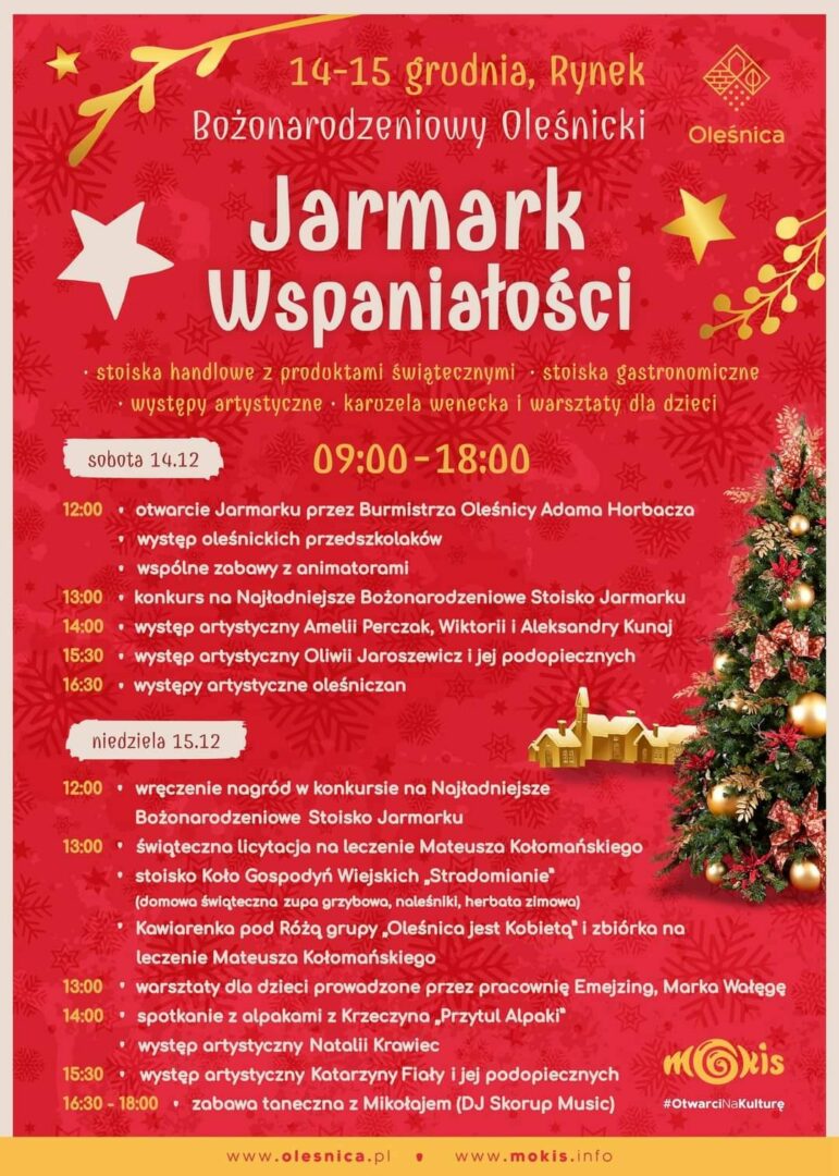 Urząd Miasta Oleśnicy oraz Miejski Ośrodek Kultury i Sztuki w Oleśnicy serdecznie zapraszają na Bożonarodzeniowy Oleśnicki Jarmark Wspaniałości, który przeniesie nas w magiczny klimat świąt. To wydarzenie, które na stałe wpisało się w kalendarz oleśnickich atrakcji.