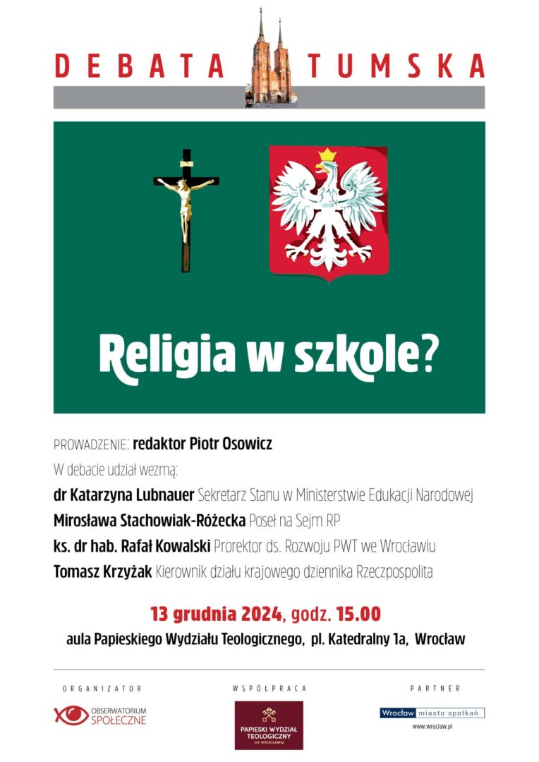 Czy religia powinna być obecna w szkolnych murach? To pytanie, które od lat wzbudza gorące dyskusje w Polsce. Już w najbliższy piątek, 13 grudnia 2024 r., w auli Papieskiego Wydziału Teologicznego we Wrocławiu, odbędzie się debata na ten temat, na którą zaproszeni są wszyscy zainteresowani – studenci, absolwenci, nauczyciele, rodzice i dziadkowie. Wstęp wolny.