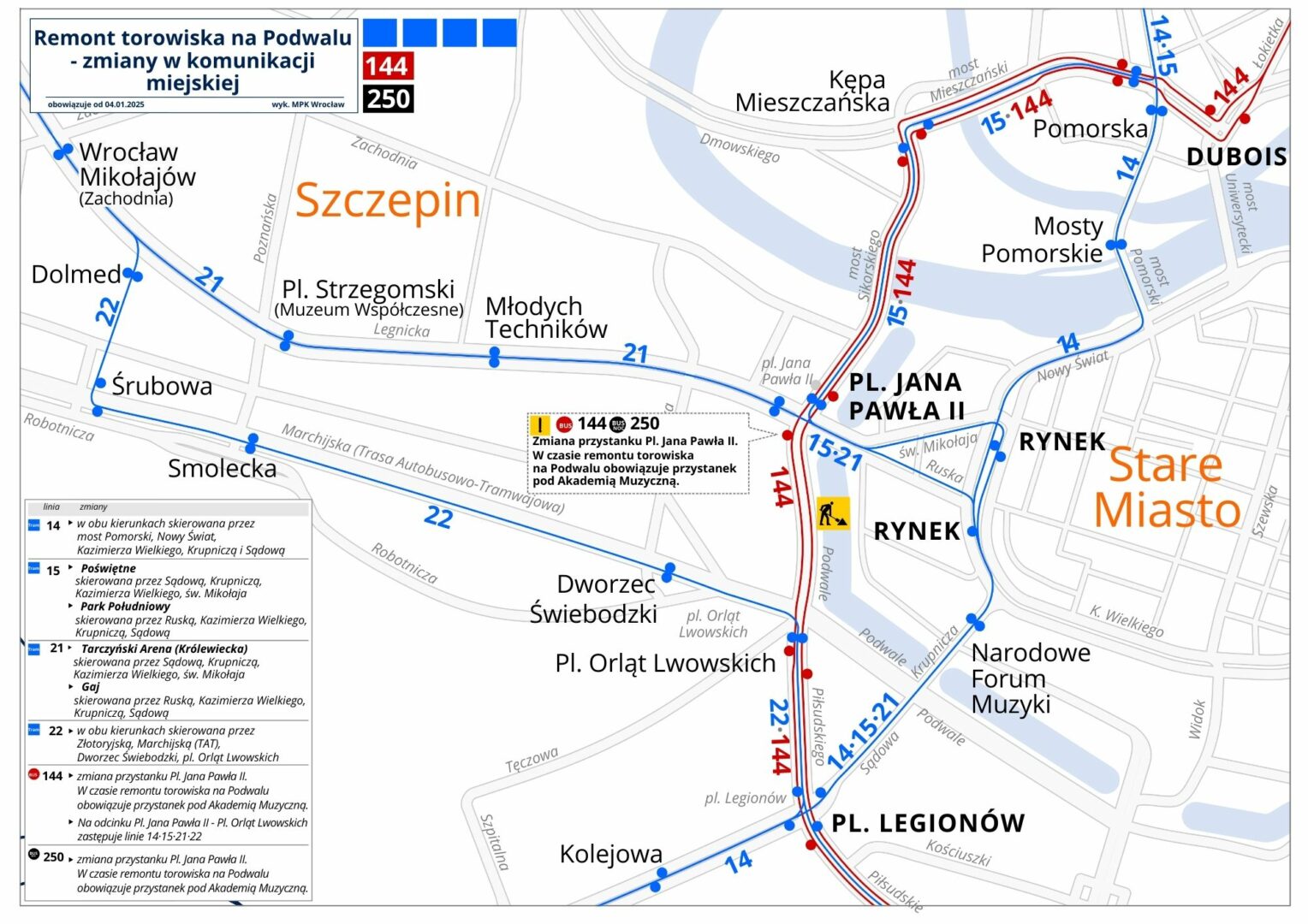 4 stycznia rusza drugi etap prac torowych na Placu Powstańców Wielkopolskich we Wrocławiu. Odcinek między pl. Jana Pawła a pl. Orląt Lwowskich zostanie wyłączony z ruchu tramwajowego, co wpłynie na kursowanie linii 14, 15, 21 i 22.