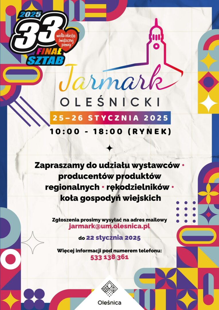 Już 25-26 stycznia Oleśnica zaprasza na Oleśnicki Jarmark połączony z Finałem Wielkiej Orkiestry Świątecznej Pomocy Oleśnica. W godzinach od 10:00 do 19:00, Rynek miasta stanie się sercem wspólnego grania dla Wielkiej Orkiestry Świątecznej Pomocy.