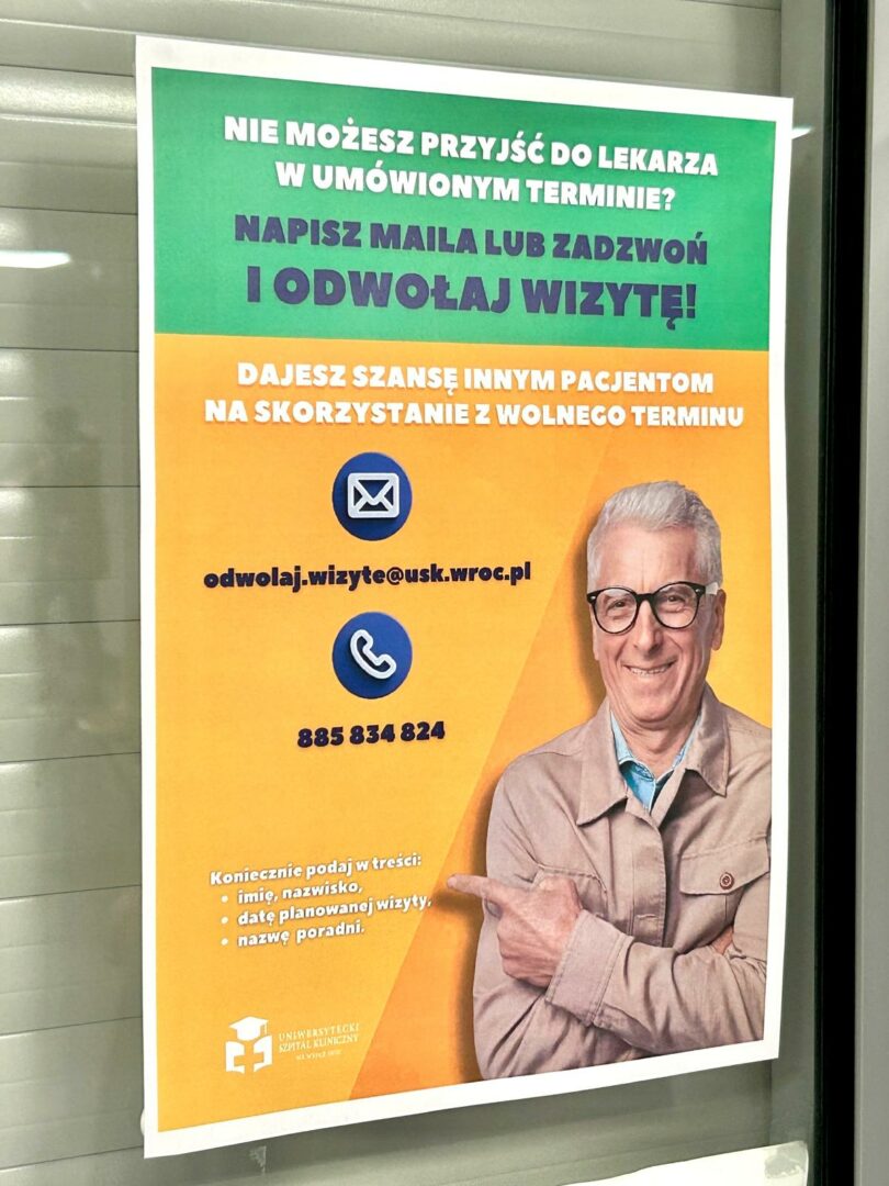 Dodatkowo, w ramach akcji informacyjnej w rejestracji i w przychodniach USK we Wrocławiu pojawiły się wyraziste plakaty z hasłami zachęcającymi do zgłaszania odwołania wizyty. Taki sam plakat pojawił się na stronie internetowej szpitala oraz w mediach społecznościowych.