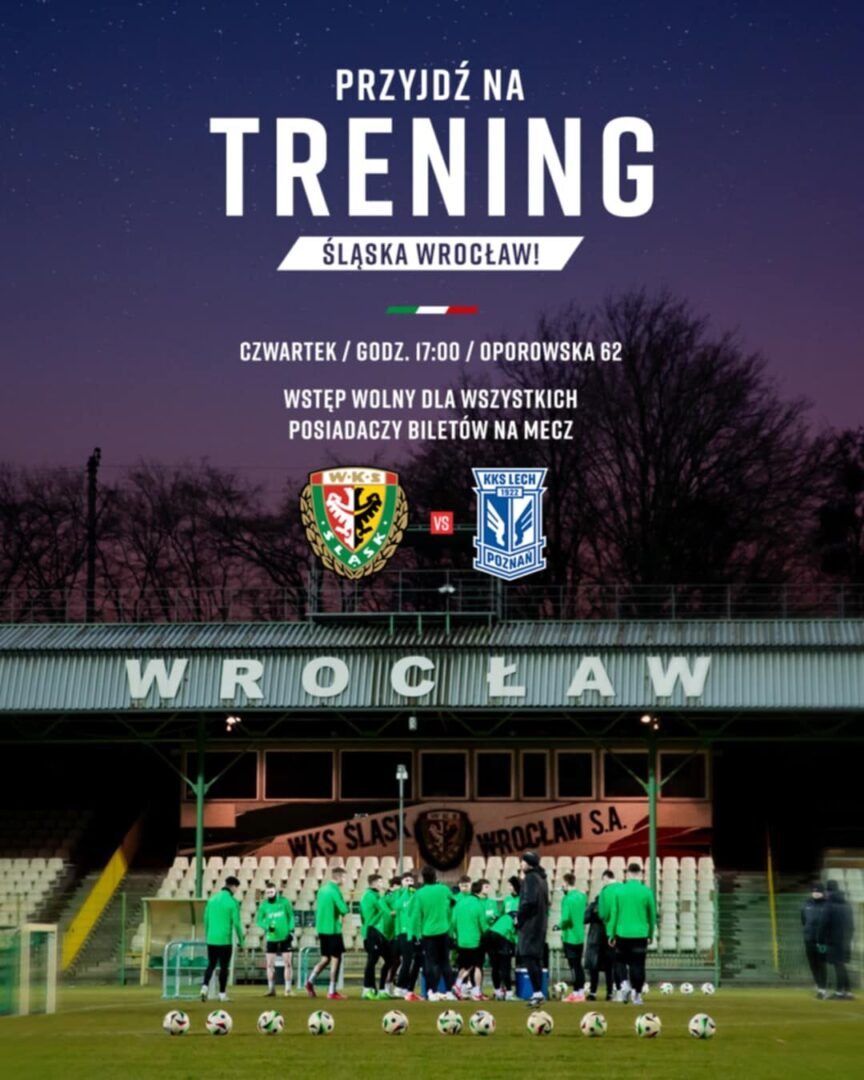 Trening, na którym mogą pojawić się kibice, odbędzie się w wyjątkowej scenerii. Zajęcia rozpoczną o godz. 17 się na głównej płycie stadionu przy ul. Oporowskiej 62 i zostaną przeprowadzone przy włączonych jupiterach. Szczegóły wydarzenia przedstawia Jędrzej Rybak, rzecznik prasowy Śląska.