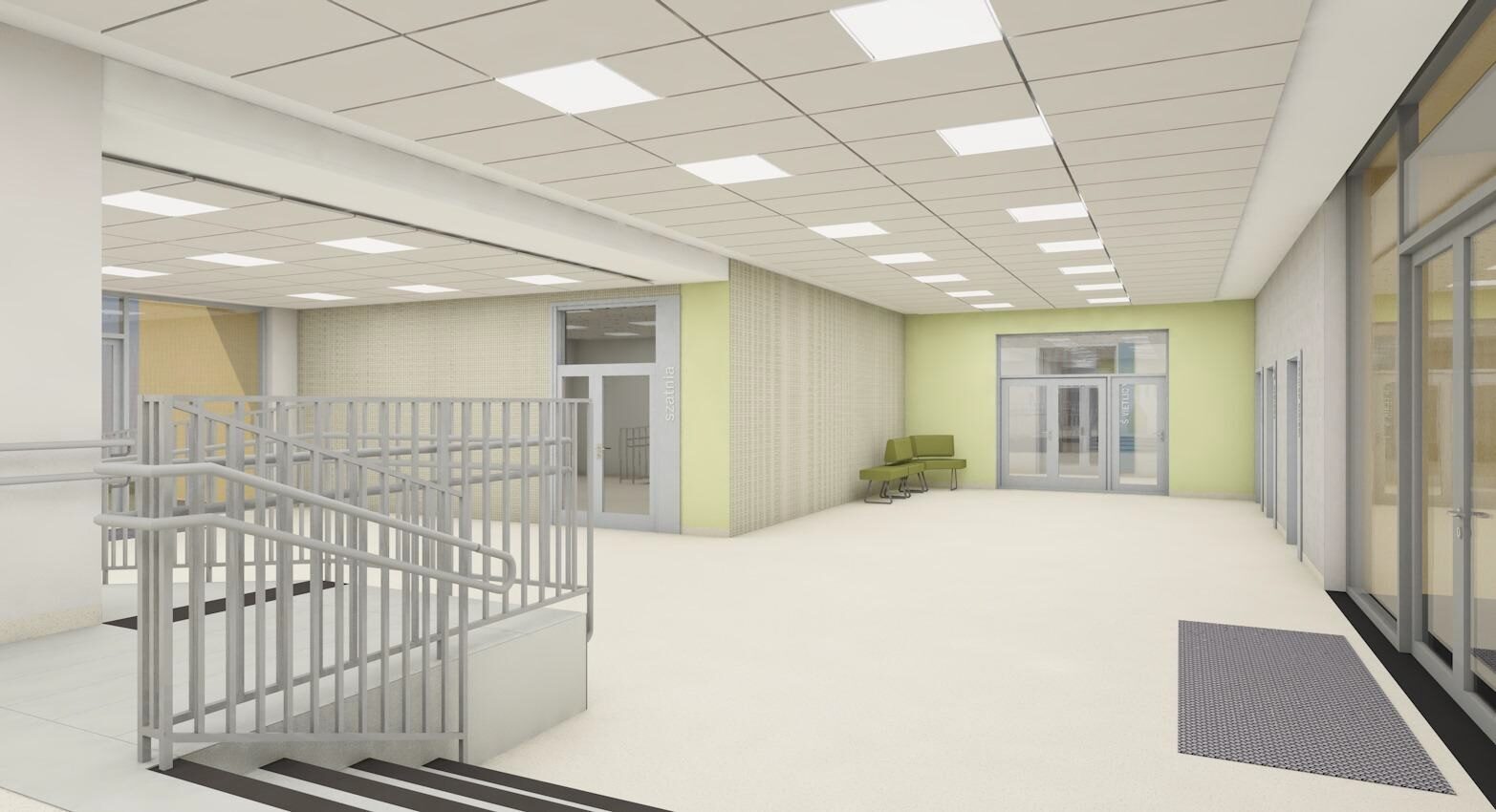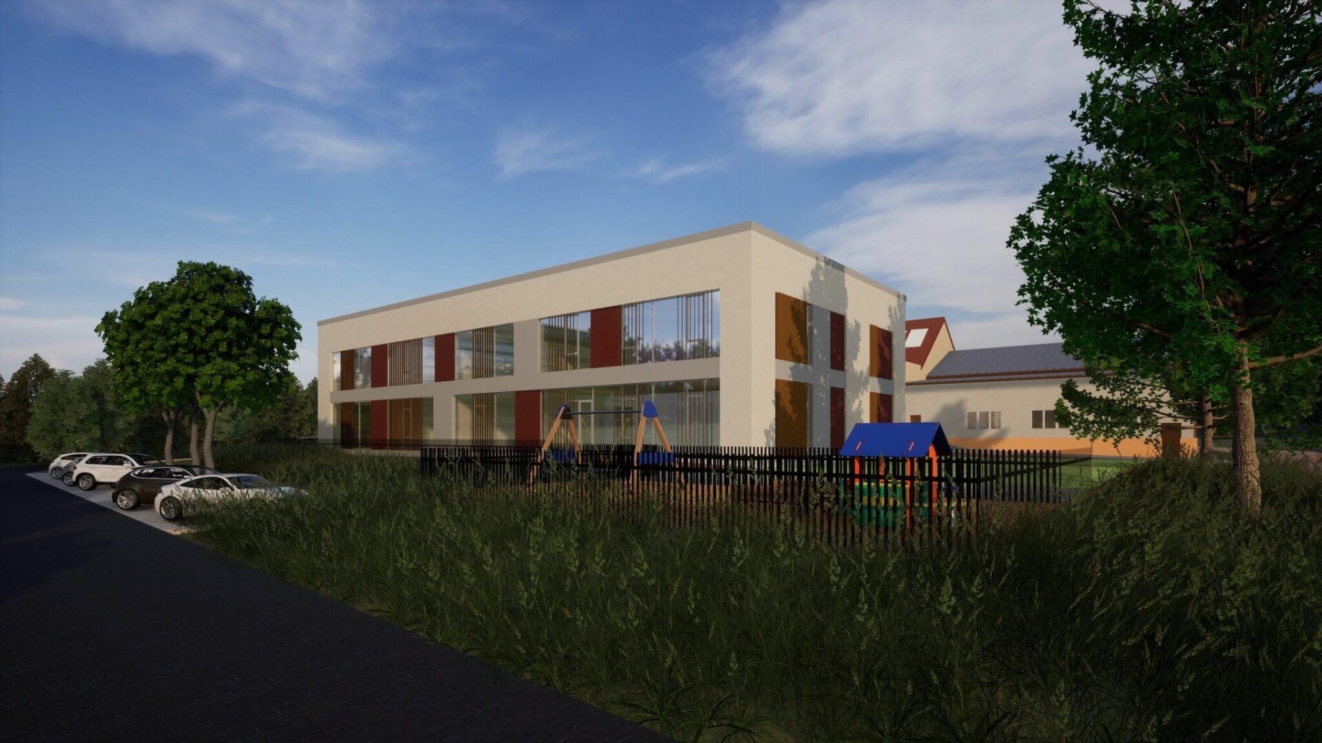 - W nowym budynku zaprojektowano 8 sal lekcyjnych z zapleczami, salę informatyczną, świetlicę z osobnym wyjściem na ogród, pokój nauczycielski, węzły sanitarne, szatnie i komunikację oraz dodatkowo strefę „zerówki” z osobnym wejściem, zapleczem, szatnią oraz sanitariatami. Łącznik w parterze pomieści przestronny hol, a na piętrze stanowić będzie oprócz komunikacji funkcję odpoczynku dla dzieci, które również będą miały do dyspozycji przestronny taras.